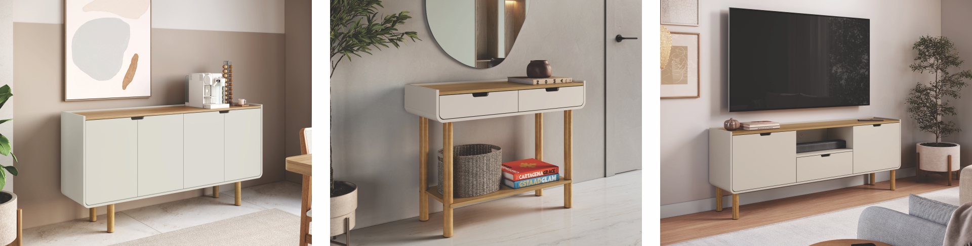 Na Linha Aura, o off-white reforça uma proposta alinhada ao momento atual do design: mobiliário equilibrado, visualmente leve e preparado para composições versáteis.